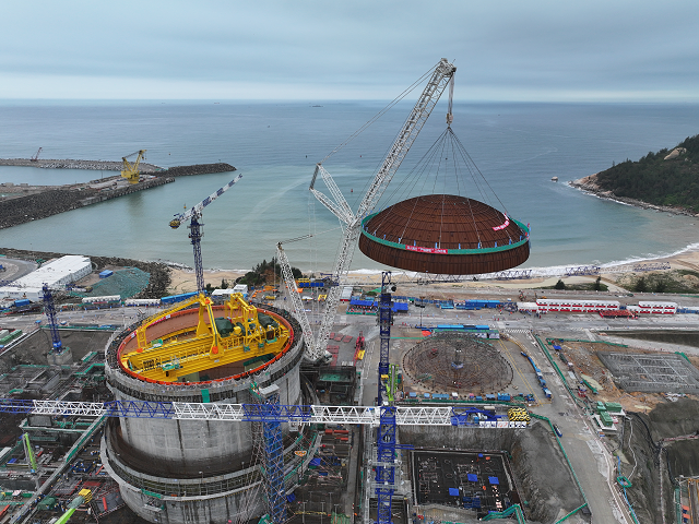 穹顶位于核岛顶部,是保证反映堆厂房完全性和密封性的主要组成局部。陆丰核电名目5号机组穹顶由预埋件、钢板及焊接在外侧的角钢等局部组成,分量达238.5吨,面积相称于4个规范篮球场的巨细,是核岛钢衬里施工中全体吊装就位的最大钢构件。