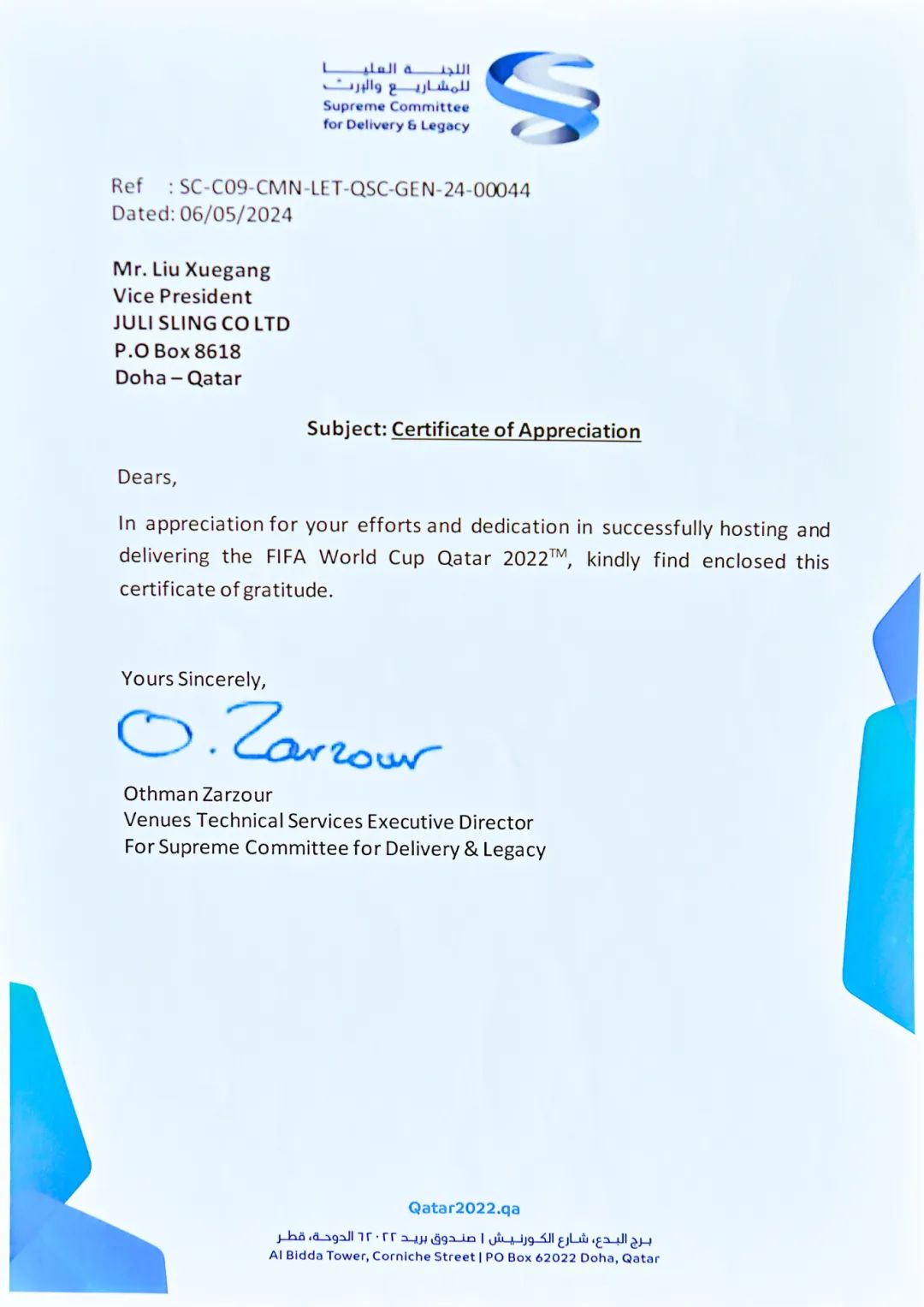 跟着2024年暖和的春意,咱们收到了来自名目业主——卡塔尔托付和遗产最高委员会(SUPREME COMMITTEE FOR DELIVERY & LEGACY)的感谢感动信及承认证书,这是对咱们过往尽力的最好必定。信中的每一个字句,都是对咱们团队辛苦任务和不懈尽力的高度承认。这份光荣不只属于咱们,也属于每位撑持和存眷咱们名目的人。您们的信赖和撑持是咱们最可贵的财产,是咱们不时进步的能源源泉。